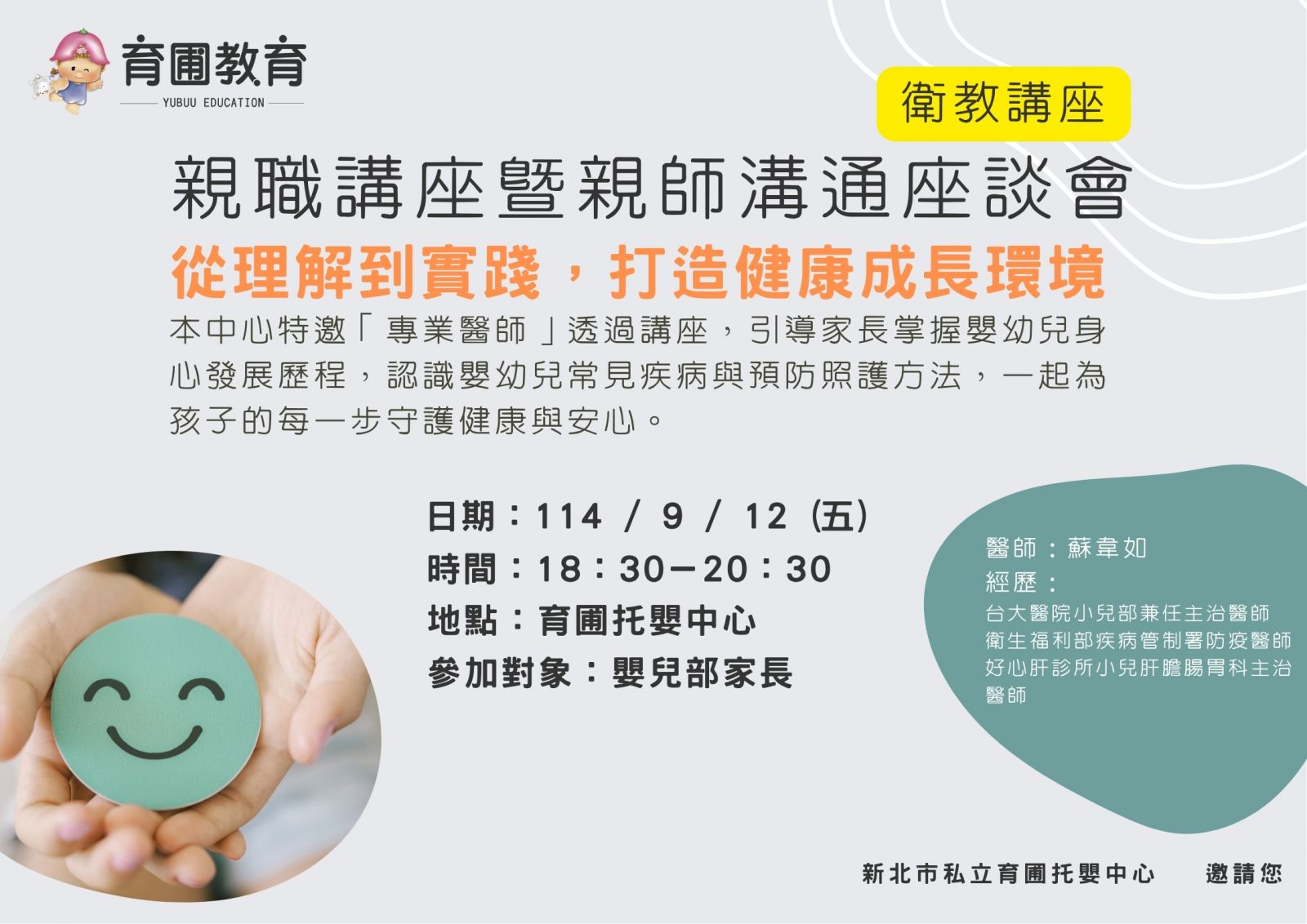 想更了解寶貝的成長需求嗎?育圃嬰兒部將帶您全面掌握嬰幼兒生理與心理發展脈絡,同時了解嬰幼兒常見疾病的預防與照顧技巧,讓您在家也能輕鬆守護孩子的健康。讓寶貝在愛與安全中快樂長大!