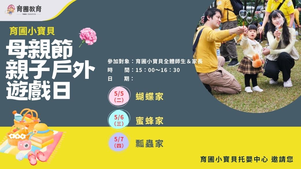 育圃小寶貝誠摯邀請寶貝及爸爸媽媽們,參加這場溫馨又充滿笑聲的親子戶外活動,在輕鬆的野餐及遊戲氛圍中,拉近彼此的距離,創造專屬於家庭的美好回憶唷!